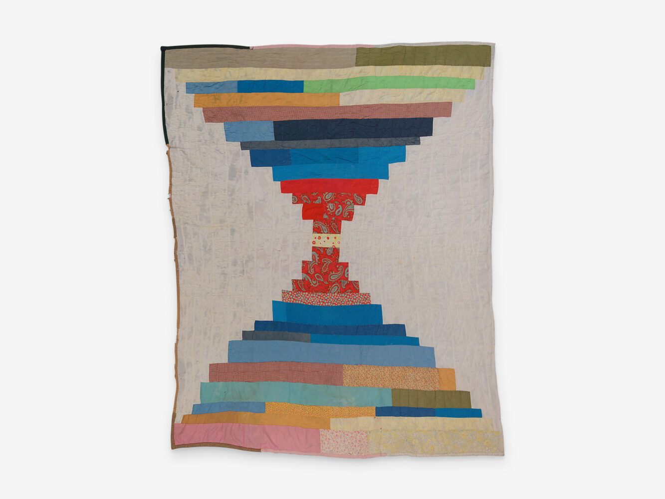 Uninhibited by the conventions of fine or folk art, the Gee’s Bend quilts constitute a crucial chapter in the history of American art. The vivid and multi-layered textiles preserve numerous vocabularies and approaches to form; the interplay between symbols and asymmetry refers to histories of African textiles while also evoking the formal qualities of Modernist painting, something evidenced in the quilts of Sue Willie Seltzer (b.1922; d.2010), Nancy Pettway (b.1935) and Rebecca Myles Jones (b.1896; d.1986). Forgoing more traditional art historical classifications, the quiltmakers organise their quilts into loose categories: ‘Abstraction & Improvisation’, ‘Pattern & Geometry’, ‘Housetop & Bricklayer’, ‘Lazy Gal’ and ‘Work Clothes’. These process-based taxonomies often lend the works their titles, as is demonstrated in Lucy Mingo’s (b.1931) ‘Housetop’ – ‘Log Cabin’ Variation (c.1985) and Minder Coleman’s ‘Log Cabin’ – ‘Courthouse Steps’ Variation (Local Name: ‘Bricklayer’) (c.1940). But the presence of such organisational parameters has never prevented formal experimentation: ‘Star’ – Ten-Block Variation (1937) by Nettie Young (b.1916; d.2010) sees six and eight-point stars in gold, blue and red held within a patchwork lattice.