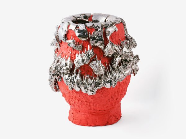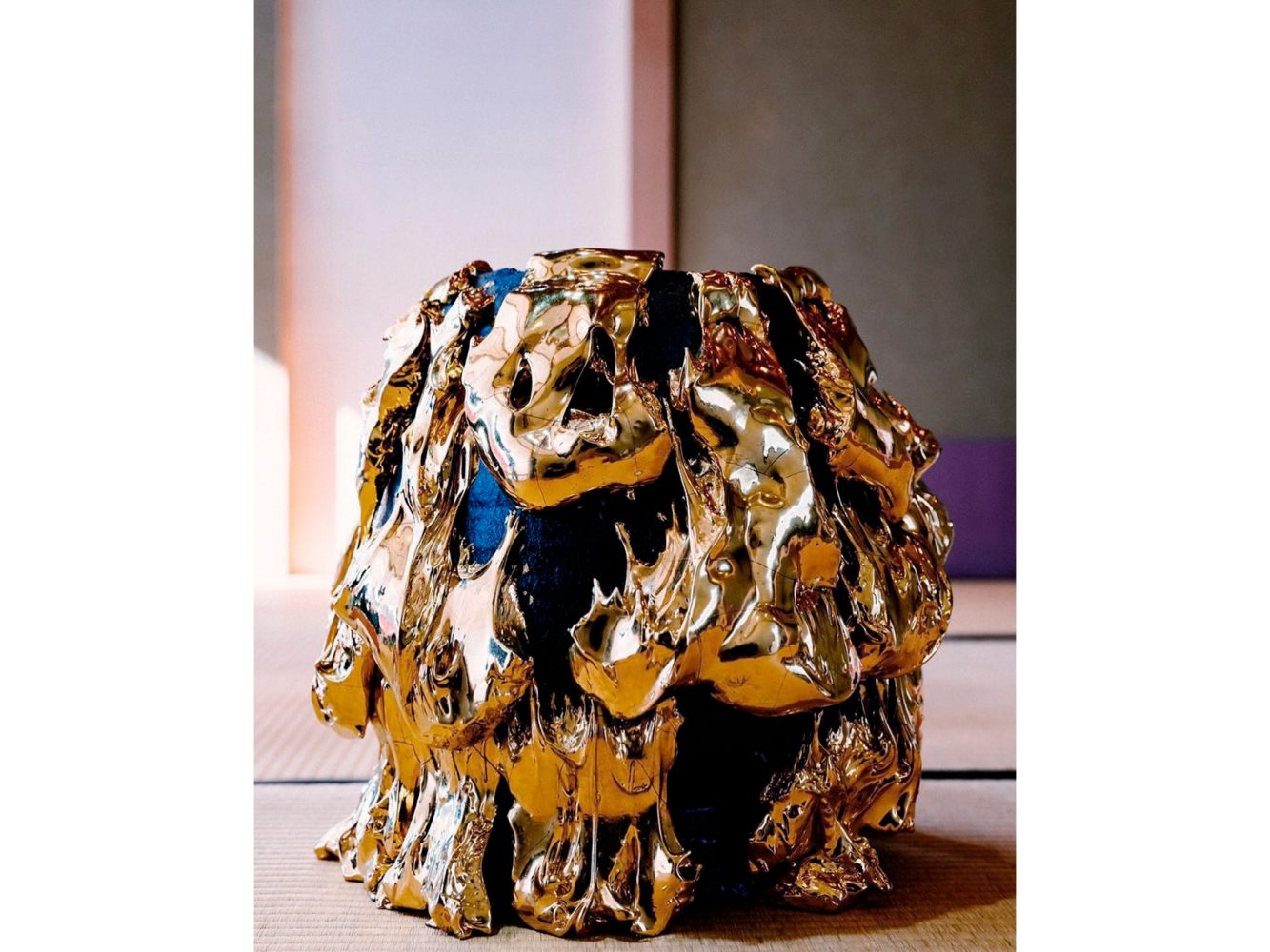 Kuwata (b. 1981) lives and works in Toki City, Gifu, Japan and it is from this mountainous terrain that the artist finds the stones prominent in his sculptures. One of the traditional Japanese techniques he uses is called ishi-haze or stone explosion, in which stones are allowed to overheat in the kiln to the point where they rupture. Conventionally, this technique employs small stones in the making of tea ceramics; however Kuwata uses oversized rocks to distort his forms as the stones melt or explode. Kuwata also employs kairagi, another Japanese technique, which is used to create imperfections in the glaze caused by shrinking and cracking. Kuwata is drawn to the imperfections resulting from this process, which he employs to its extreme so that the outer layer of the sculpture is fractured and appears to be slipping away from the colour beneath. The uncertainty of the method does not allow Kuwata complete control over the resulting form, enhancing the organic nature and dysfunctionality of his objects.