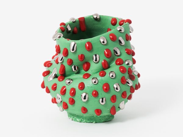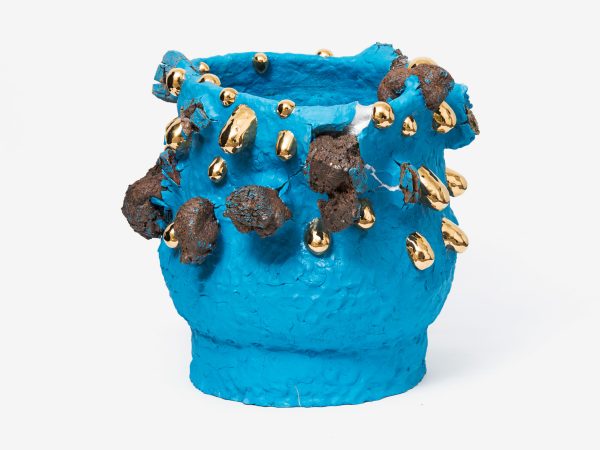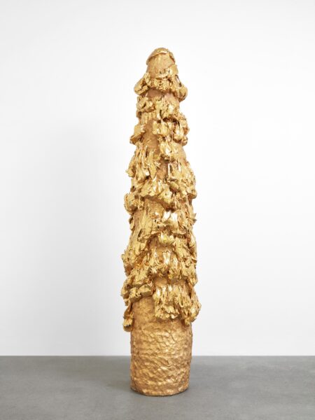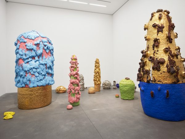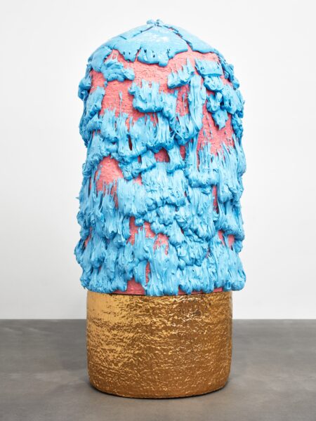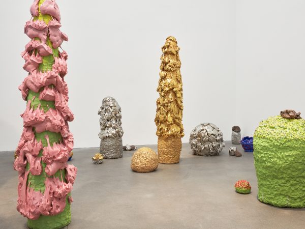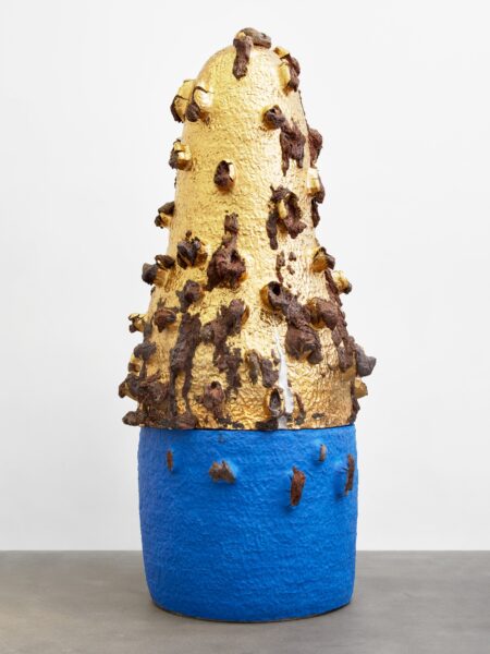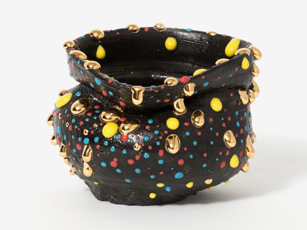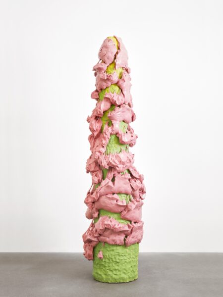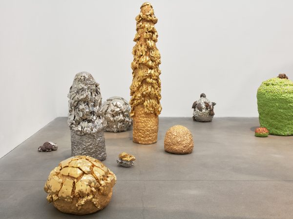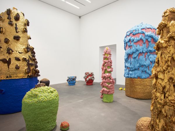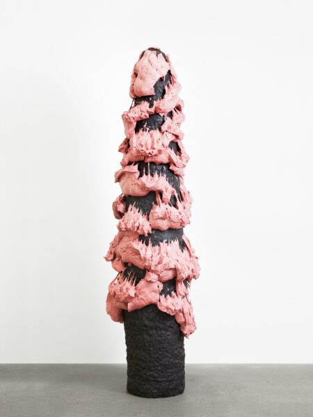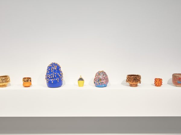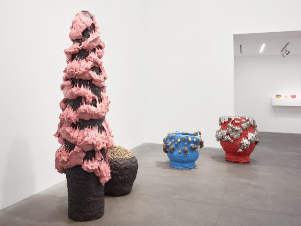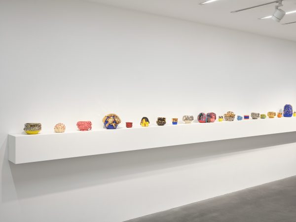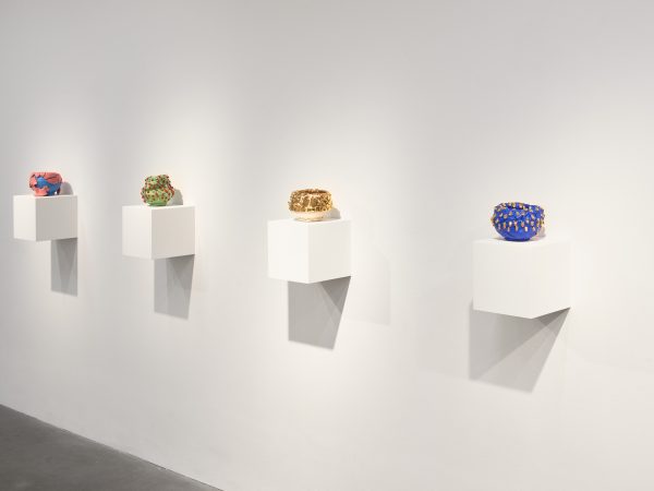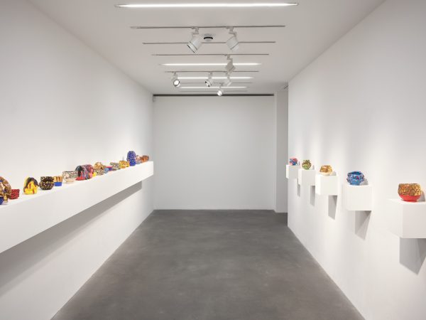 This exhibition contains a number of large-scale works made when Kuwata was resident artist in Shigaraki, Japan, earlier this year. Upon entering the gallery, the viewer is confronted with a large stalagmite sculpture beside a small tea bowl. The main space contains a variety of large vessels and standing sculptures, encrusted with sherbert-hued colours, or gold and silver glazes, which appear like rings of icing around heavy ceramic bases. In the side space Kuwata exhibits a series of small, brightly coloured tea bowls that span the length of the wall. Kuwata often refers to these as drip bowls, with beads of glaze hand painted onto their exteriors that could appear to be coloured droplets of sweat emanating from within.
