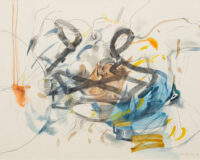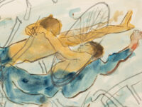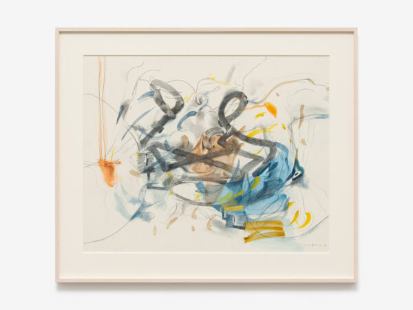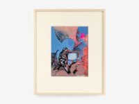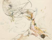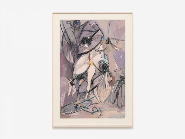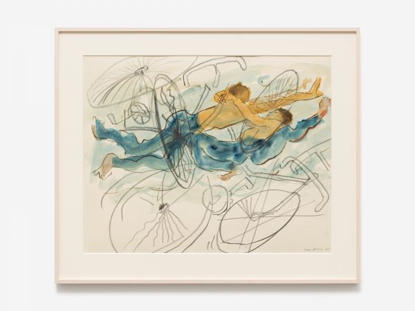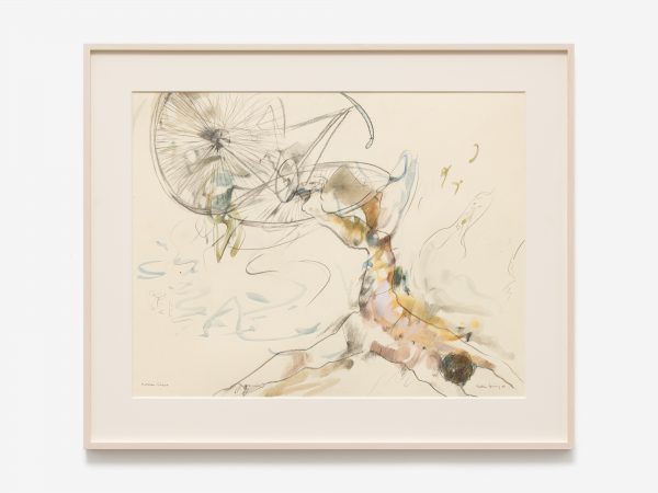 In 1988, the artist began working on a series of images in which the form of the bicycle is central. Many of these works were inspired by a bicycle accident Tanning had witnessed near her studio on the Lower East Side. The turbulence of the accident is conveyed in images with titles such as Tangle (1989), Reckless (1989), Hell Bent (1988) and Further Chaos (1988). They also embody another critical theme for Tanning throughout her career: the existence of alternative realities and readings that oscillate between multiple states. In the gouache Between Lives (1989) one figure pierces the heart of another in its embrace, while in the watercolour from which the exhibition takes its title, Worlds in Collision (1988), two youthful figures engulfed by bicycle wheels appear to float in the middle of the frame caught in a moment either of being fatally thrown or dancing in air. Its title also evokes the controversial book by Immanuel Velikovsky, Worlds in Collision (1950), which theorised cataclysmic celestial events and their impact on the earth and human history.