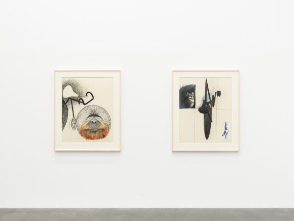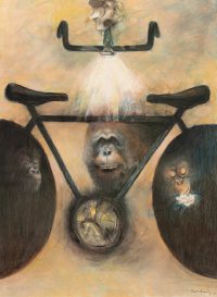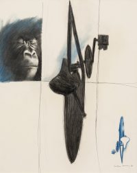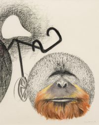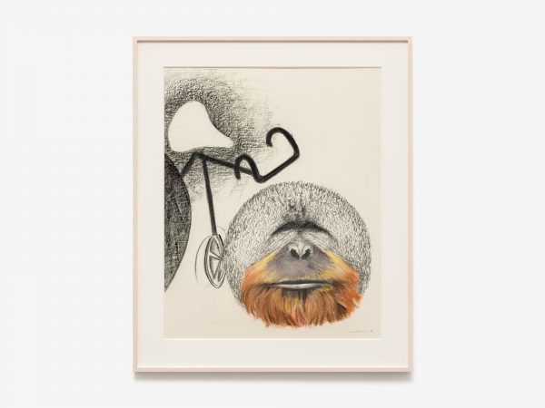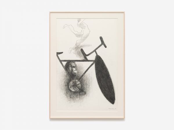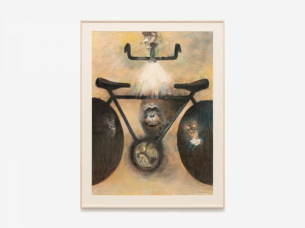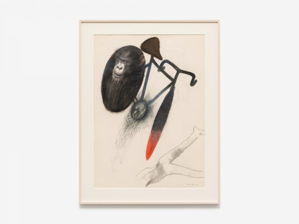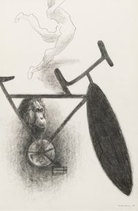 Among the works there is also a selection from Tanning’s Messages, a series of fourteen large-scale charcoal and pastel works from 1989-90. These drawings explore the motif of the bicycle now juxtaposed with images of primates, and offer Tanning’s meditations on evolution, humankind’s place in the world, and the power of technology and art. As Tanning wrote in 1990: ‘Gorillas pose some questions about who is who on this earth…The gorilla remembers, too, back to the eye of time, when somehow he was left behind, man jumped on a bicycle and sped away and does not now remember…here I am an artist who has promised to bring them together’.2