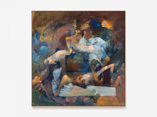 The works presented were created during the decade following Tanning’s return to New York in 1980 after having lived in France for some 30 years. Many encapsulate the energy of city life she enjoyed in Manhattan, propelled forward by speed and sound. One large scale painting, Pounding Strong (1981), embodies Tanning’s reflections on her new life in a city very different from her time living there as a young artist in the 1930s and 40s. In an interview with Carlo McCormick in 1990 she describes the painting’s conception: ‘Looking out the window at these crazy kids careening down Fifth Avenue on roller skates, wearing earphones, and carrying their powerful radios. They are like archangels. I wouldn’t be too surprised if they took to the air’.1