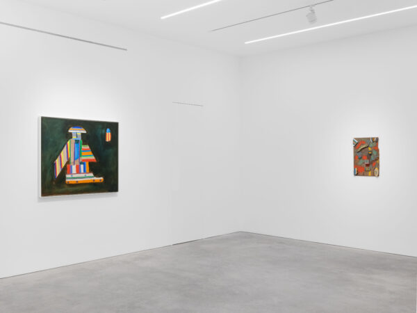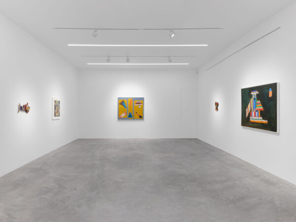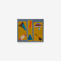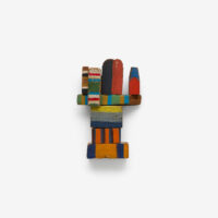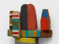 Parsons returned to sculpture in 1965, which had been one of the artist’s first mediums. She experimented with elements of found material such as driftwood, signage, and disassembled furniture that she collected from the beach near her home. Once assembled into shapes reminiscent of buildings, toys or masks, Parsons treated these assemblages with paint in the same way she would a canvas, covering the items in blocks of pigment or using gestural lines, as can be seen in works like Beach Police (1968) and Flight (1981). Such a process gave new life to these forgotten objects that now seem to carry the weight of mementos; these sculptures are indelibly connected to Parsons’ deep interest in the mysticism contained within Native American craft and artistic production.