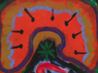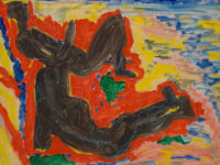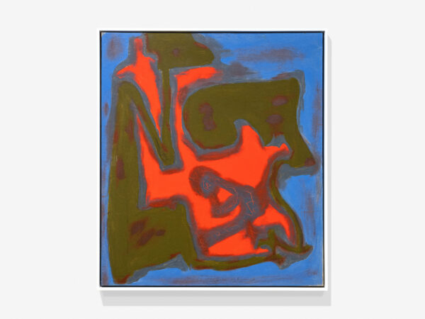 Parsons’ practice was concerned largely with the exploration of colour. Her paintings can be characterised through their large, sinuous swathes of colour that playfully interact, punctuating her saturated canvases. Much like other works included in this exhibition, the forms that feature in Summer Fire (1959) do not possess hard, defined edges, but rather stand apart from one another through drastic changes in tonality: an almost fluorescent orange glows in the centre of the canvas, the vibrancy of this inclusion amplified by the subtler greens, greys and blues that surround it. Parsons’ use of the grattage technique, etching into her painterly surface, reveals more streaks of orange even in places the colour has been painted over. For Parsons, the bold colours that feature in works such as Snake Plant (1975) and Fun (1974) had the ability to infuse forms with a sort of kinetic energy. Her move towards abstraction was in part influenced by her experience of attending a rodeo in the mid-1940s: ‘I saw all the movement, the noise, the colour, the excitement, the passion. I thought, my God, how can you ever capture this except in an abstract sense?’4