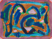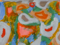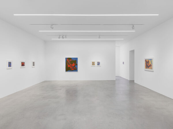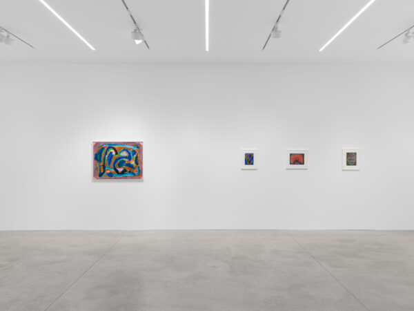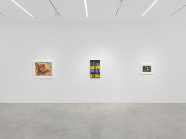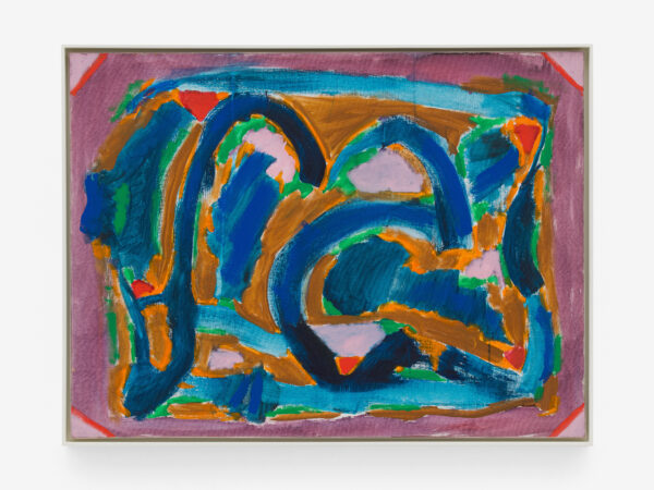 Incorporated alongside paintings on canvas, this exhibition also includes a selection of Parsons’ paintings and drawings on paper and newsprint. These works bring a diaristic perspective to Parsons’ corpus: Parsons was known to urgently open her sketchbook in order to document the energy she experienced in specific locations and times, abstractly capturing a moment as one might ordinarily do with a photograph. A playful immediacy is palpable in these works. Drawings such as Seed Pods (1968) and Cocoon (1968) exemplify Parsons’ experimental groupings of colour and shape; such is emphasised by the visibility of the white paper underneath and between her pen marks. A similar technique is implemented in her acrylic on paper works, where Parsons’ visible brushstrokes communicate a sense of movement and speed, leaving behind pockets of bright white that create a visual dynamism to the compositions. The intimate scale of these works offers a more personal insight into Parsons’ practice.
