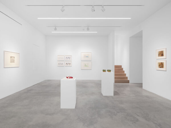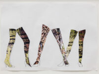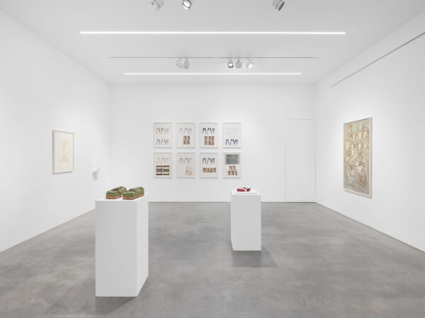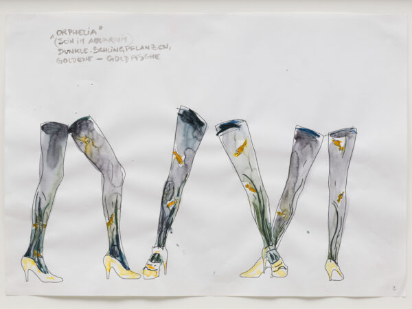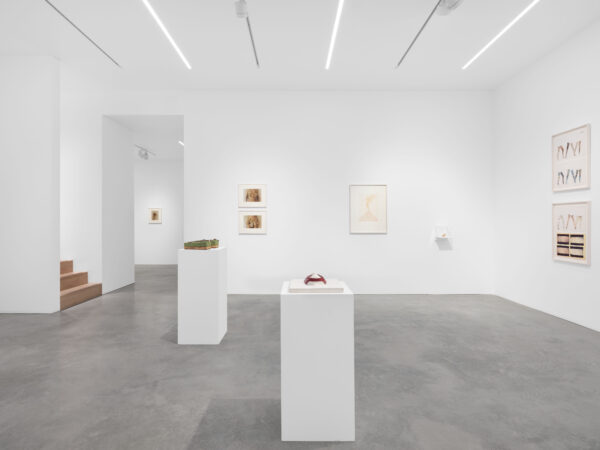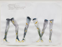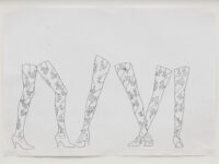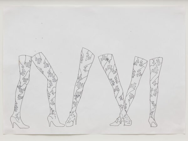 The works in the exhibition trace Jürgenssen’s varied yet constant critique of prevailing hierarchies, namely the male-dominated Viennese Actionism movement, and honours her artistic avowal ‘to use all the media that were available’. A major work within the show relates to Jürgenssen’s 1988 portfolio of twenty-four drawings for Wolford, the Austrian textile manufacturer, producers of luxury hosiery and underwear. The works depict women’s disembodied legs and shoes, a recurring motif throughout the artist’s practice. Jürgenssen handles her conceptual concerns with humour and material dexterity, working within tenets of Surrealism to subtly undermine both gender hierarchies and the art historical canon. While the Wolford drawings were never actually commissioned, the series marks an important moment in Jürgenssen’s wider practice, where labour, the feminine, and the object intersect.