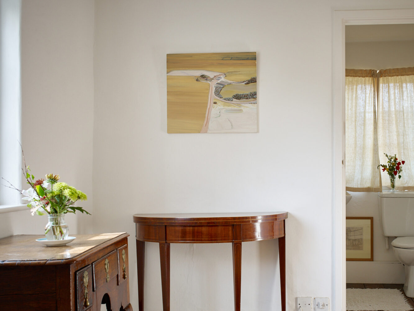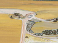 Throughout her career, Rhodes produced a highly individual body of paintings describing the encroachment of human activity and occupation upon ‘natural’ landscapes. Primarily adopting aerial viewpoints, Rhodes favoured what she called ‘hidden areas’ or ‘left-over land’: industrial estates, airports, motorways and reservoirs, unpeopled and existing at the margin of more defined (urban or rural) environments.