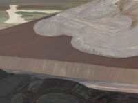 Rendered in minute detail yet with painterly breadth, Rhodes’s paintings are fictional syntheses: composite landscapes drawn from disparate sources, including photographs taken by the artist herself or found in books on geography and geology, industrial archaeology and urban planning. Rhodes integrated these disjointed topographies through a complex, intuitive drawing and painting process. Her palette is subtle and particular, often using muted compound colours. (‘I like it bland’, she once said, though somewhat disingenuously.) Pictorial space can be compressed, even flattened, despite the vast distances described. Both foreground and horizon are mostly eliminated – Rhodes spoke of wanting an ‘egalitarian’ composition.