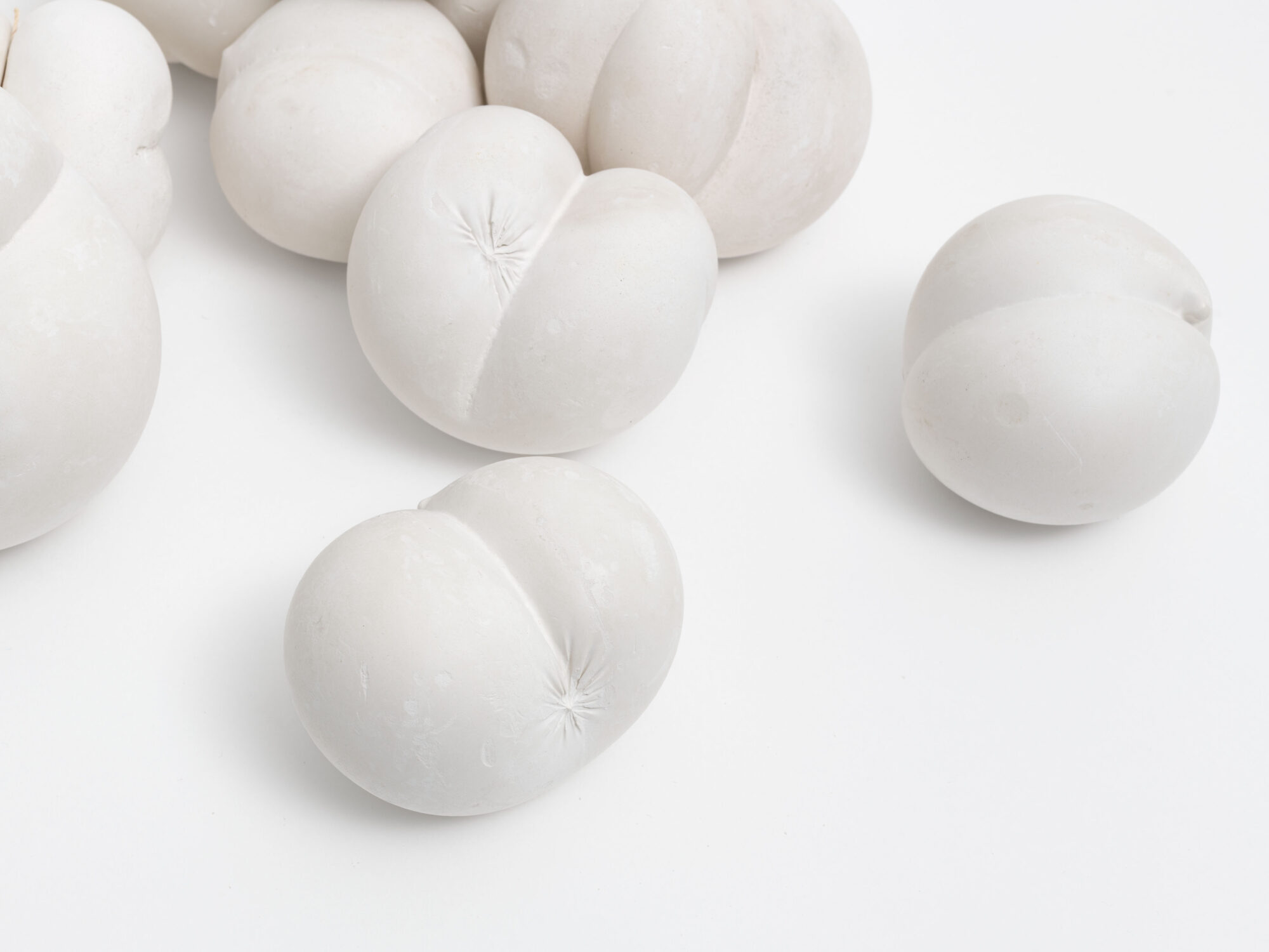 This exhibition tells the story of Bartuszová’s groundbreaking sculptural experimentation, including a process she referred to as ‘gravistimulation’. Inspired by an experience with her daughter Anna when playing outside with an inflatable ball, Bartuszová began her radical process of casting with condoms and balloons. Filled with her own breath, Bartuszová poured liquid plaster inside the inflated material, shaping it using pressure, often submerging and manipulating the rubber vessels underwater. The resulting organic and biomorphic forms, moulded through compression and sometimes by binding the hardening plaster with string, become symbols of human vulnerability and the constraints that limit the potential of living things within a finite lifespan. In other works, Bartuszová introduced organic material including tree branches, rocks and stones which she gathered on walks in the Slovak Ore Mountains and on the banks of the Hornád river, near Košice. She embedded these sculptures in her wall-based sculptural reliefs, and created forms in which the plaster is squeezed through and constricted by the weight of the found rocks. In the 1960s and 1970s, Bartuszová also cast in aluminium and bronze, and later in the 1980s, she incorporated man-made materials such as Perspex, utilising its transparency as a poetic metaphor for frozen water or melting snow. In one rare sculptural relief included in the exhibition, she incorporated colour by painting the surface blue.