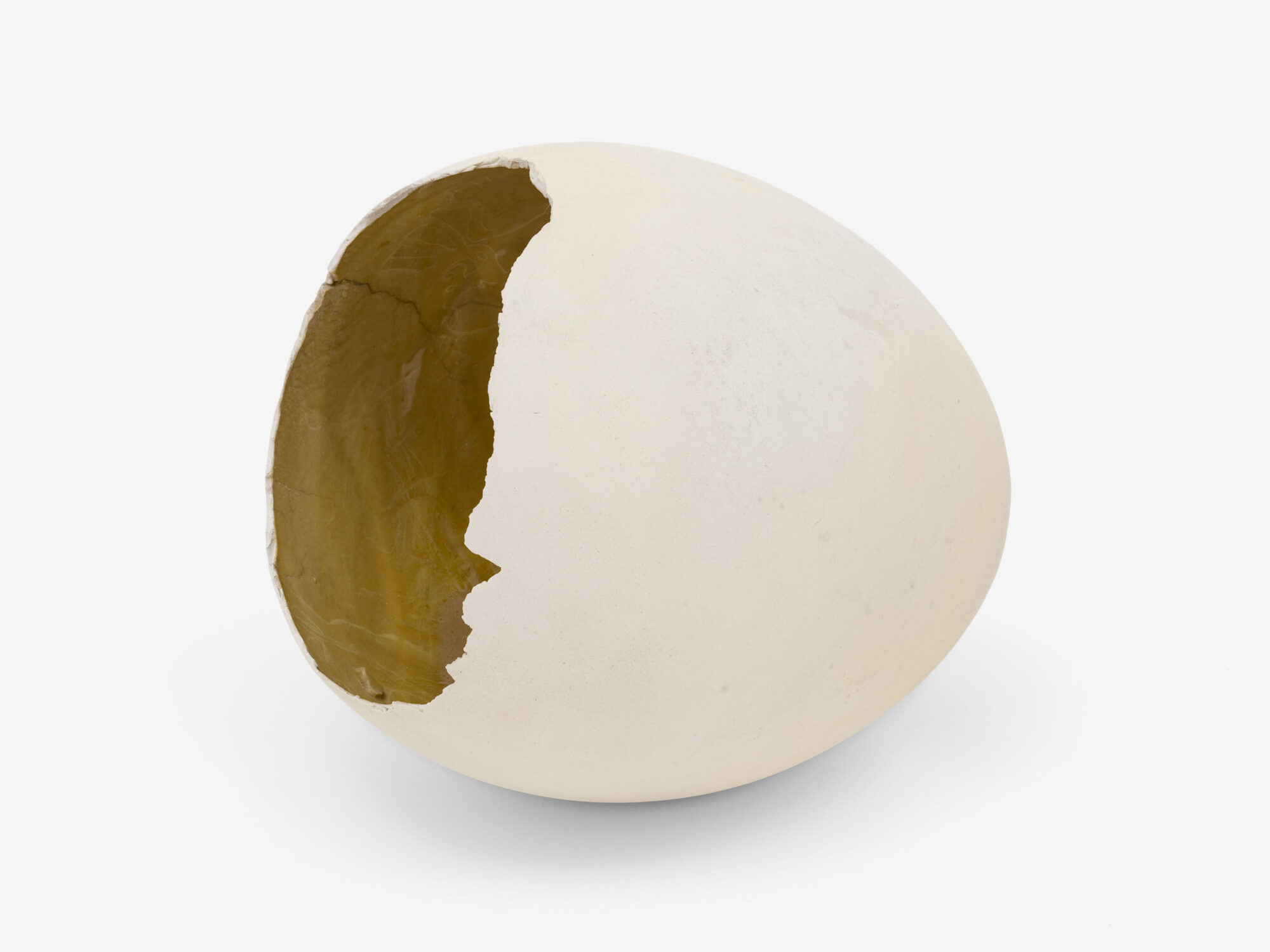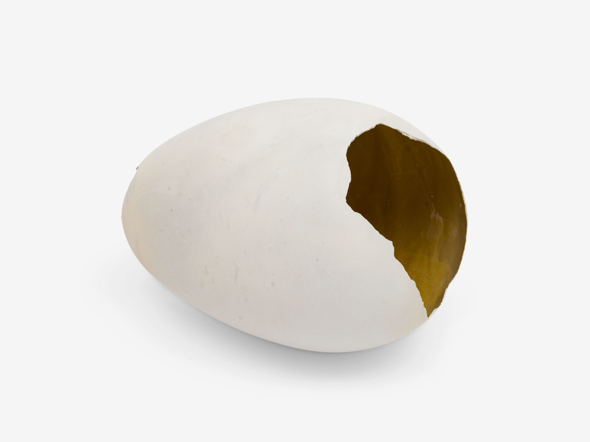 The later works on show from the 1980s emphasise themes of fragility, fertility and motherhood, as Bartuszová wrote: ‘In the quiet of depression / in the depression of the quiet / I am waiting hidden in the shell / of an egg to be born again’. During this decade, she introduced a new process she referred to as ‘Pneumatic Casting’, often using much larger meteorological balloons, which harnessed the effects of air pressure, allowing her sculptures to transition into fragmented and hollow forms. The metaphor of the egg, a form which first emerged in her earlier work, is perforated and many of her sculptures from this period resemble empty cocoons and broken shells. Through these works, Bartuszová sought to capture the precarity of life, channelling her internal feelings of personal crisis with external threats to the environment and the world around her, as she wrote ‘a tiny void full of a tiny infinite universe’.