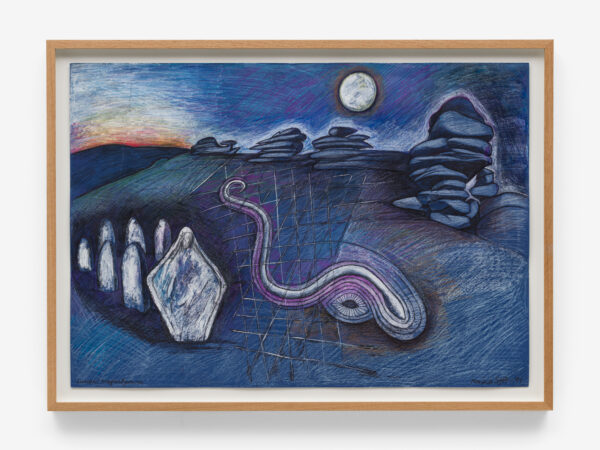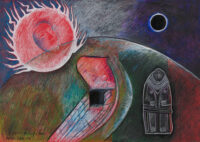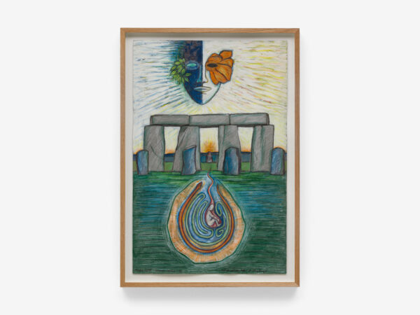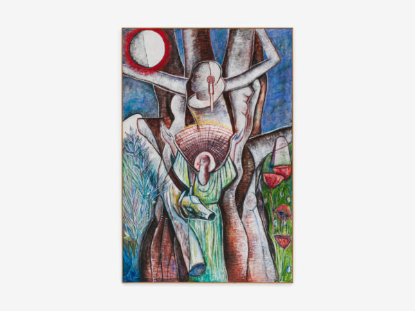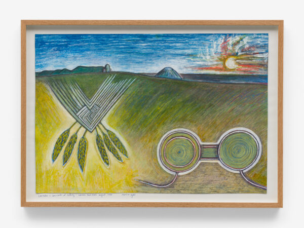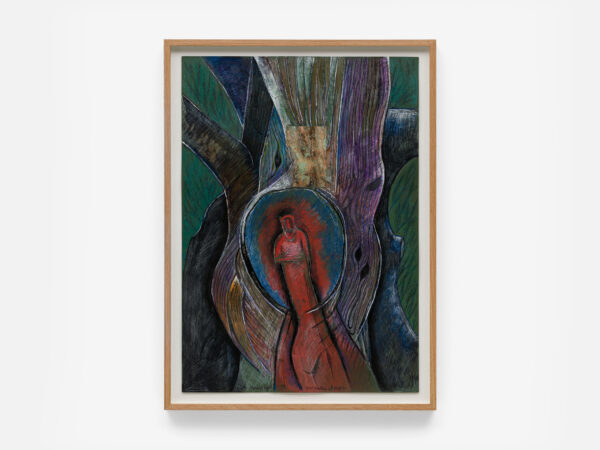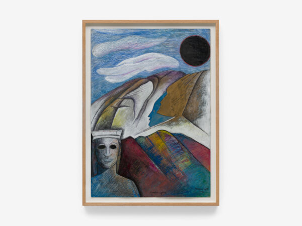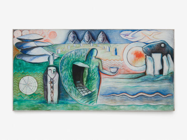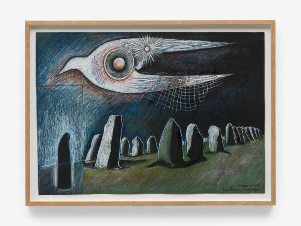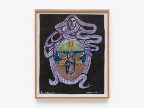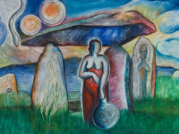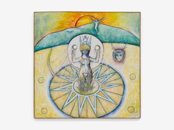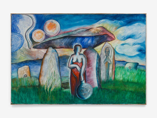 Sjöö moved to the UK in her 20s, living mainly in Bristol, where she dedicated her life ‘to creating paintings that speak of women’s lives, our history and sacredness’. Some of the work in the exhibition references Sjöö’s years spent travelling to ancient sites in Malta, Sweden, Wales and to Neolithic centres of the ancient Great Mother, pilgrimages to the sacred land in England, Ireland, Scotland and Brittany, ‘communing with the spirits and connecting with other women… involved in Earth Mysteries’. She communicated with what she called ‘the ancient sisterhood’ of pre-patriarchal Goddess societies and portrayed women as strong and life-giving. When Sjöö suffered from postnatal depression following the birth of her first child, she restored herself by drawing visionary pastels while listening to sacred Hebrew music. Many of her paintings and drawings are also evocations of grief. Having been devastated by the deaths of two of her sons in 1985 and 1987.