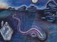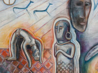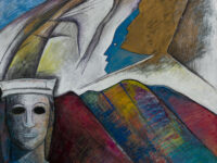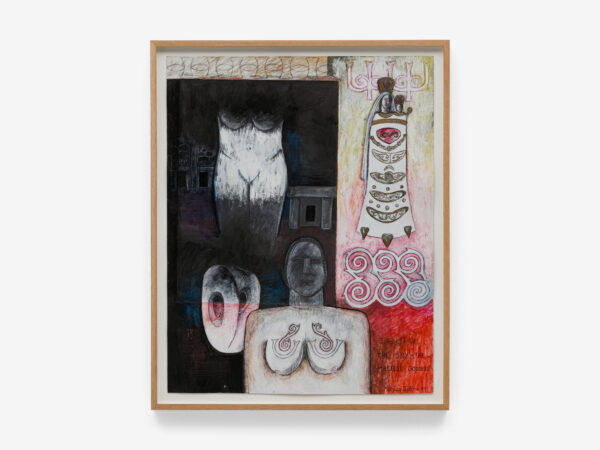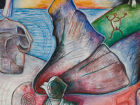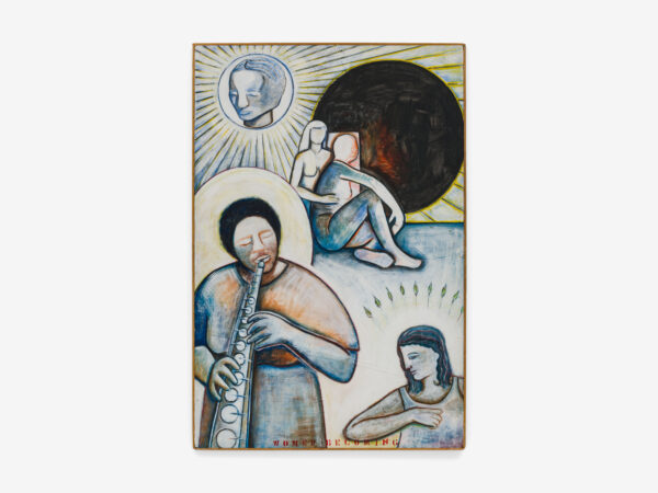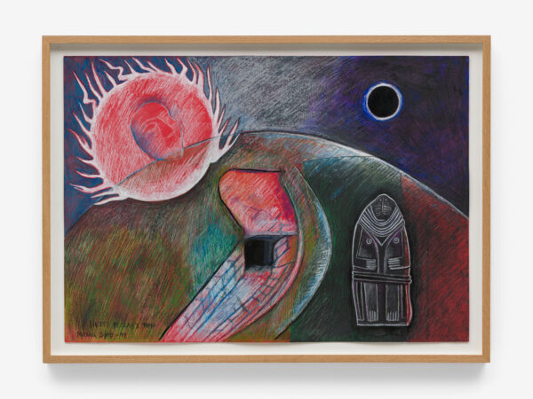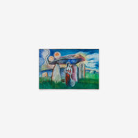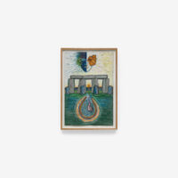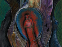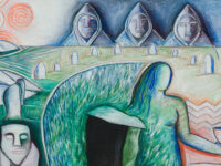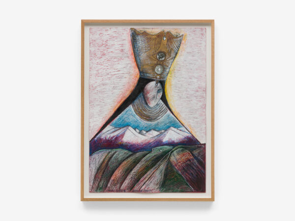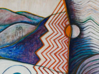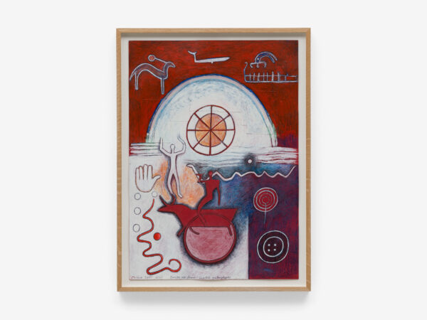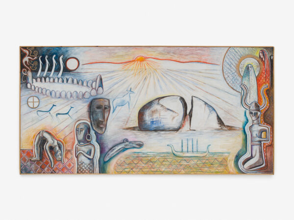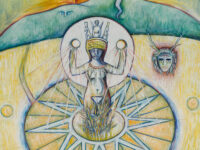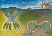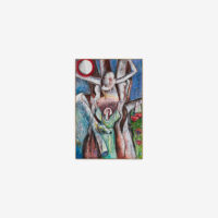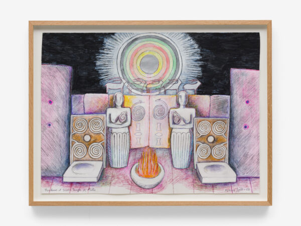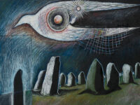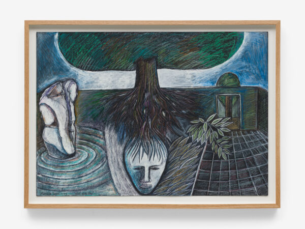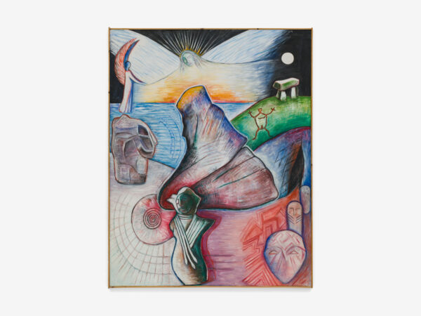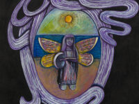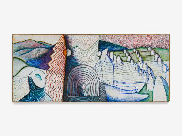 Sjöö moved to the UK in her 20s, living mainly in Bristol, where she dedicated her life ‘to creating paintings that speak of women’s lives, our history and sacredness’. Some of the work in the exhibition references Sjöö’s years spent travelling to ancient sites in Malta, Sweden, Wales and to Neolithic centres of the ancient Great Mother, pilgrimages to the sacred land in England, Ireland, Scotland and Brittany, ‘communing with the spirits and connecting with other women… involved in Earth Mysteries’. She communicated with what she called ‘the ancient sisterhood’ of pre-patriarchal Goddess societies and portrayed women as strong and life-giving. When Sjöö suffered from postnatal depression following the birth of her first child, she restored herself by drawing visionary pastels while listening to sacred Hebrew music. Many of her paintings and drawings are also evocations of grief. Having been devastated by the deaths of two of her sons in 1985 and 1987.