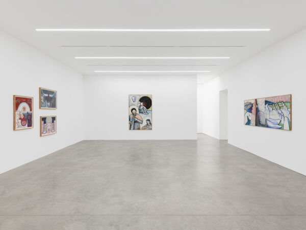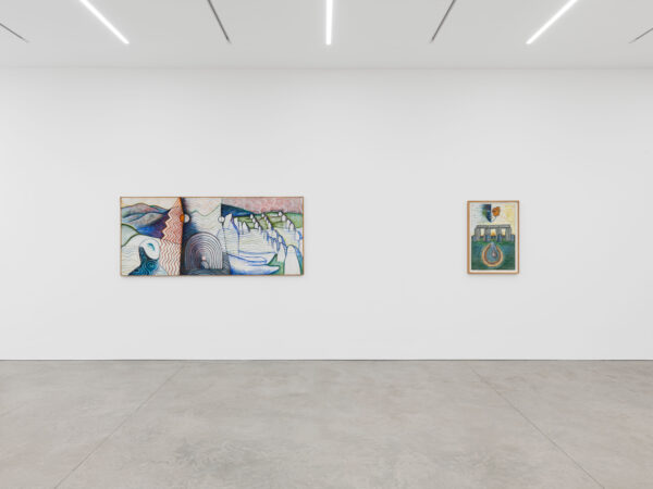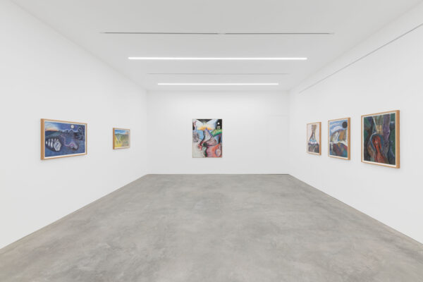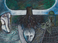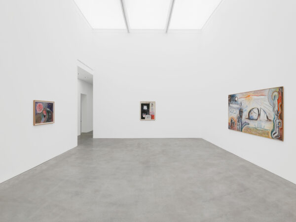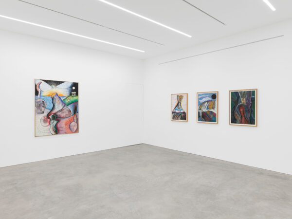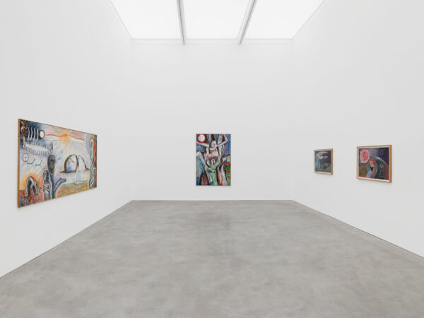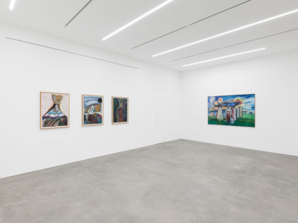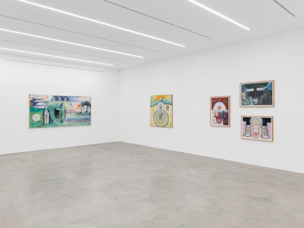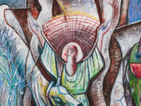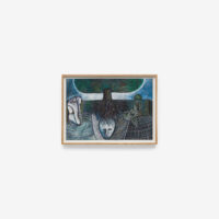 This exhibition spans over 30 years of Sjöö’s practice from 1976 up to 2003, showcasing both her paintings on canvas and paper. It reveals the artist’s sources of inspiration including pre-Aztec and monumental Aztec sculptures, Catholic art and the vibrant revolutionary paintings by artists including Diego Rivera and Frida Kahlo. The titles of Sjöö’s work in the exhibition – including Women Becoming (1976), Child of the Mother-tree (1984) and Priestess at Tarxien Temple on Malta (2003) – indicate the consistency and range of her concerns: feminism and spiritualism. Cornwall, Ancient Land of the Goddess (1993) depicts a landscape populated with stones and enigmatic characters amidst green fields, tempered with colours that evoke the sea and that possibly allude to the blood spilled for deeply held beliefs. In Sun Goddess at Stonehenge (1992) the famous giant stones are pictured beneath a floating mask, a gateway to a glowing, labyrinthine womb that shelters an embryo. Continuing the theme of the countryside as a place of profound mystery, Sjöö explained that her chosen landscapes are ‘full of spirits and the haunt of the powerful and most ancient…’