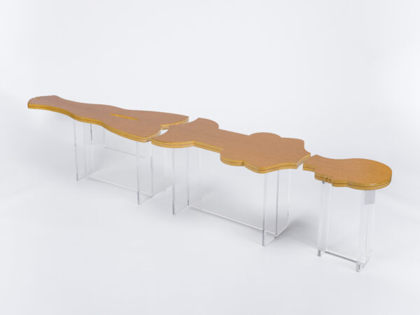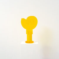 This philosophy was most visibly implemented in 1989, when Nicola L. took up permanent residence in the Chelsea Hotel in New York, her home until 2017. Collaborating with interior designer Fred Flores, Nicola L. transformed one of the hotel’s apartments into The Snail Suite: an immersive space in which rugs, headboards and tables took the shape of a snail shell. Represented at Alison Jacques through a trio of Plexiglass lamps – Snail (yellow), Snail (green) and Snail (blue) (all 1995) – this spiral form spoke to the infinite cycles of life, while also extending the logic of the Pénétrables. As curator Ruba Katrib notes: ‘the shell can be understood as both architecture and skin’.