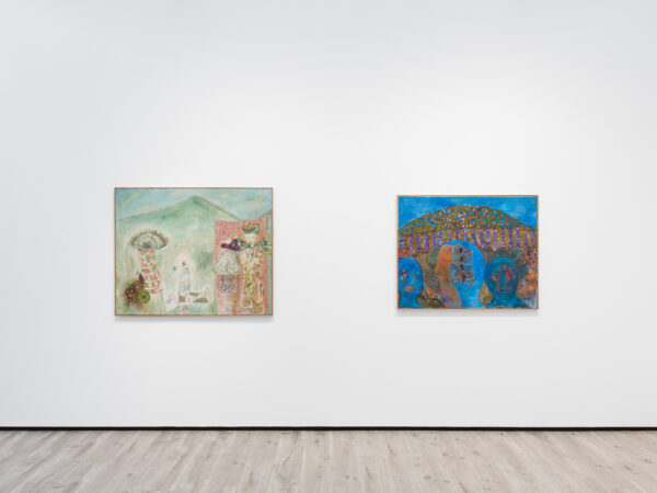Although she was part of Belgrade’s rich art scene, Blaževska’s loosely surreal approach to image-making was unique. Throughout her life, her subject matter – a commingling of invented figures, animals, birds and flowers – was consistently enigmatic. In a rare explanation, the artist called her approach ‘poetic infantilism’ but this is misleading: many of her works are complex and sophisticated and she was a brilliant colourist. In Piano Class (1970), a bird-like woman, resplendent in red, sits before a jagged yellow keyboard; she is observed by a raw figure in a crown; a fish glides into corner above her. In Pred stepenistem / Devant d’escalier (c.1973), two large, bird-like figures, their exuberant feathers green, red and purple, dance like lovers in a watery blue expanse populated by a faintly delineated staircase, sparse ruins and small, spikey beings; above them hovers a single blue and pink flower. Two years later, Blaževska painted Zacarani Prostor / Enchanted space (c.1975): a study in faded lilacs and soft blues and pinks of two human-like figures, one in what could be camouflage, the other in a lacey pink-and-red dress. They appear to be contained in a cement-like enclosure without a roof, accompanied by a spread-eagled bird and various blooms: an allusion, perhaps, to the possibility of mental liberation in the midst of physical constraint. In The Secret Laws that Govern Dreams (1983), the artist’s Serbian Orthodox religion is referenced in a large grey cross amid a landscape filled with cryptic symbols. It’s the one shape that seems grounded, solid.
