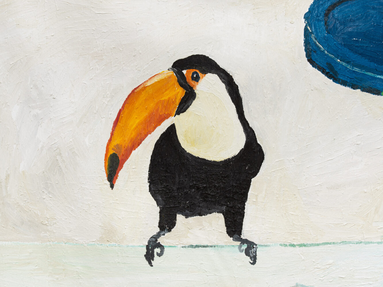 Barber’s new paintings call on symbols significant to Japan, while simultaneously referencing Western art historical narratives. The artist fictionally situates Damien Hirst’s cherry blossom paintings in Koganei park, a location famed for its real cherry blossom trees, playfully reducing Hirst’s sprawling blooms to a few intentionally slipshod marks. She also references Claes Oldenburg’s Saw Sawing (1996), a monumental installation which currently resides outside the Tokyo International Exhibition Center. Barber minimises the size of this colossal sculpture and renders it in a deliberately one dimensional, cartoonish fashion.