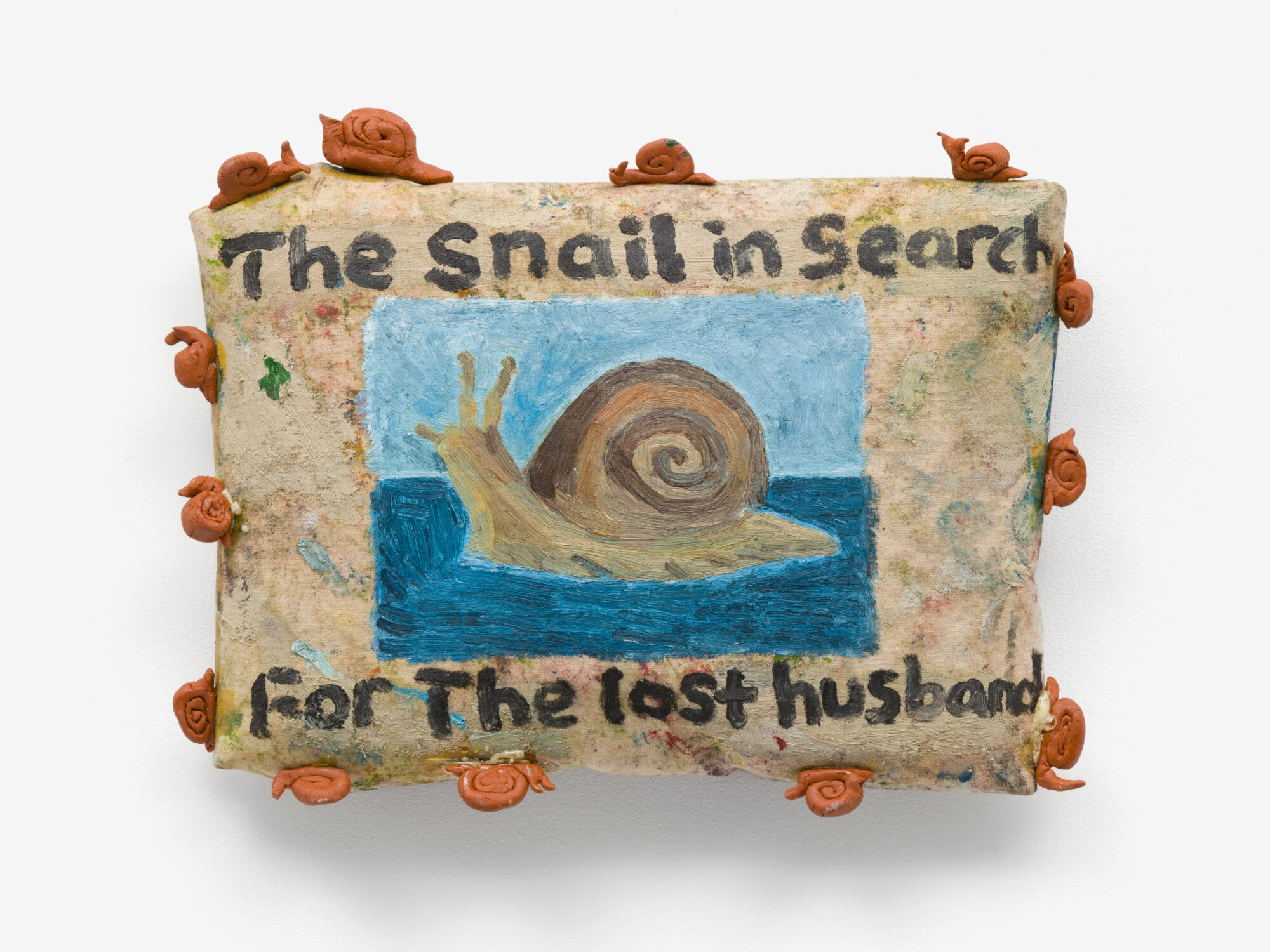 Other works respond directly to Japan’s rich cultural legacy and folk tales, relying on the ambiguous nature of myths to infuse her work with a sense of uncertain fiction (‘little fibs’, as the artist describes). Barber includes references to snails, crabs, worms and frogs, adorning her canvases with hand-carved wooden and terracotta miniatures of these creatures in a reference to their mythic importance to Japan.