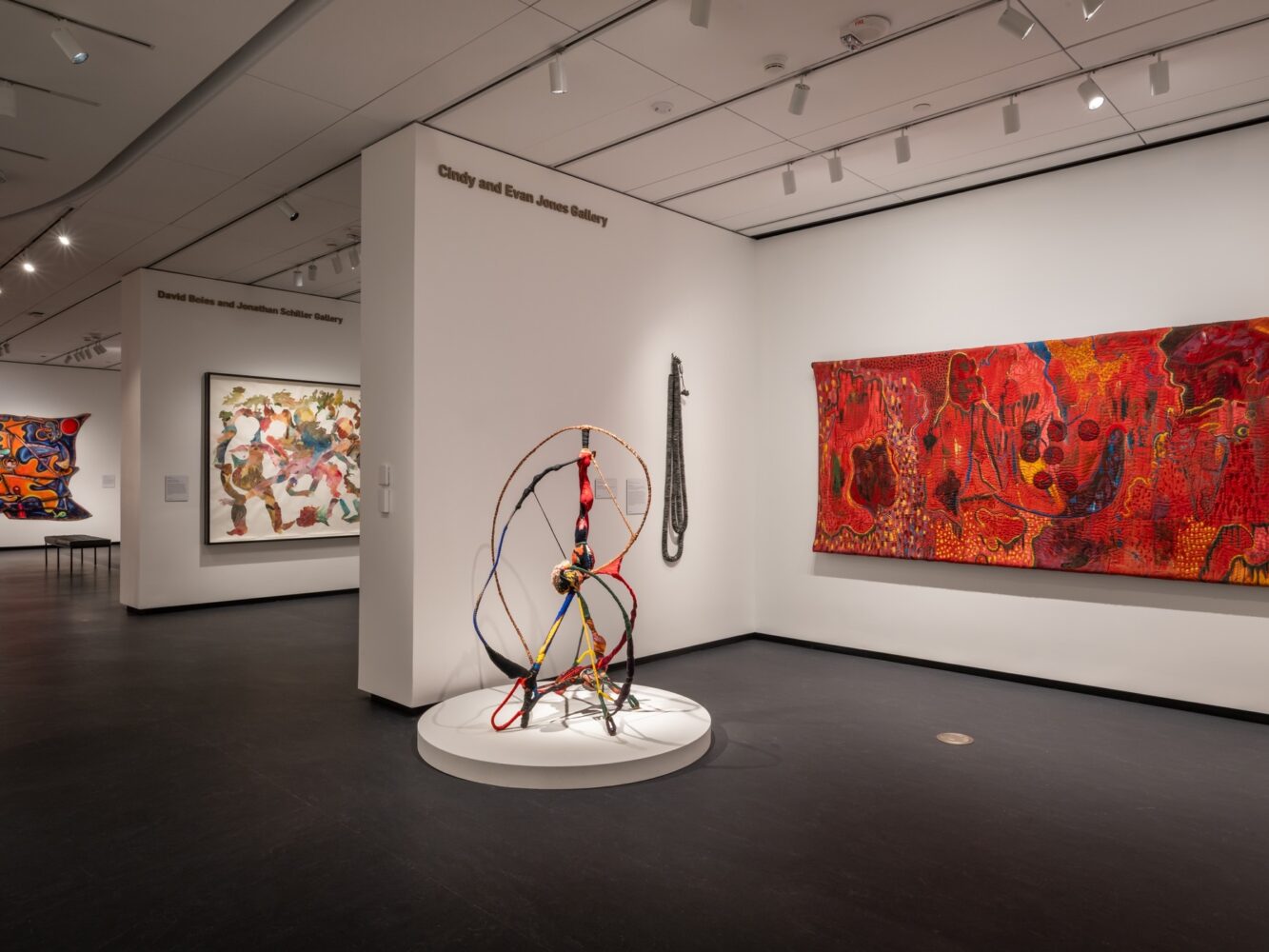 Many artists in the 1960s were using weaving and knotting to create innovative hangings and sculptures, integrating traditional craft techniques into fine art practice. The three artists whose work is shown in this room curated by Ann Coxon – Lenore Tawney, Olga de Amaral and Sheila Hicks – experimented with different weaving techniques, often looking to historical or indigenous textiles for inspiration. De Amaral and Hicks were particularly inspired by the technical brilliance of Peruvian weavings made before European colonisation.