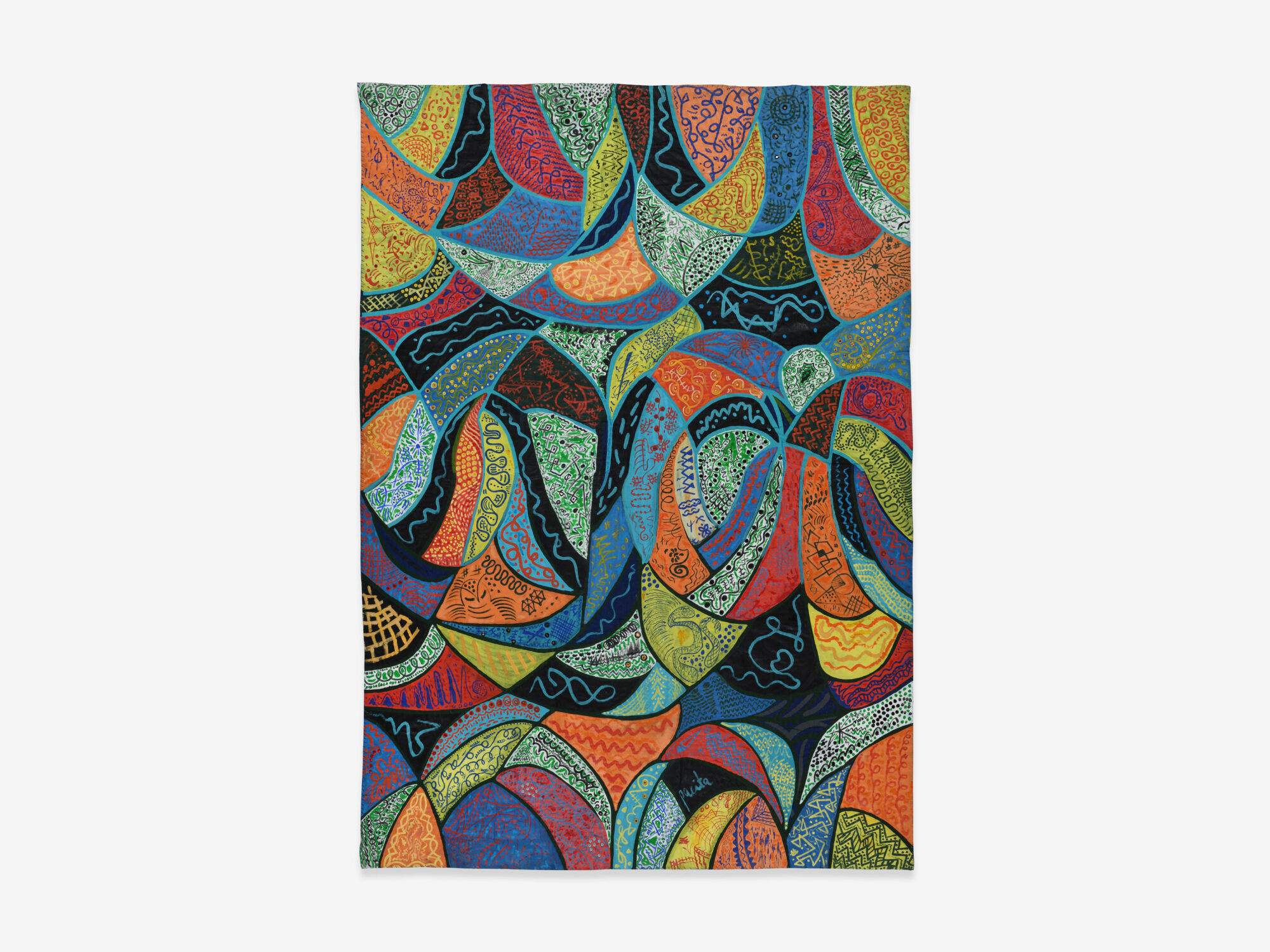 Pacita Abad’s artworks are on view Tate Modern’s ‘Artists and Society’ permanent collection display, until May 2026. Three large textiles-based works – Bacongo III, 1986, Bacongo VI, European Mask, 1990 – showcase what the artist called her ‘trapunto’ technique, adapted from the Italian word for quilted embroidery. She stitched and stuffed the textiles, adorning them with objects she found on her travels, such as shells, beads and mirrors. Her layered compositions speak to her experiences of migration and encounters across cultures.