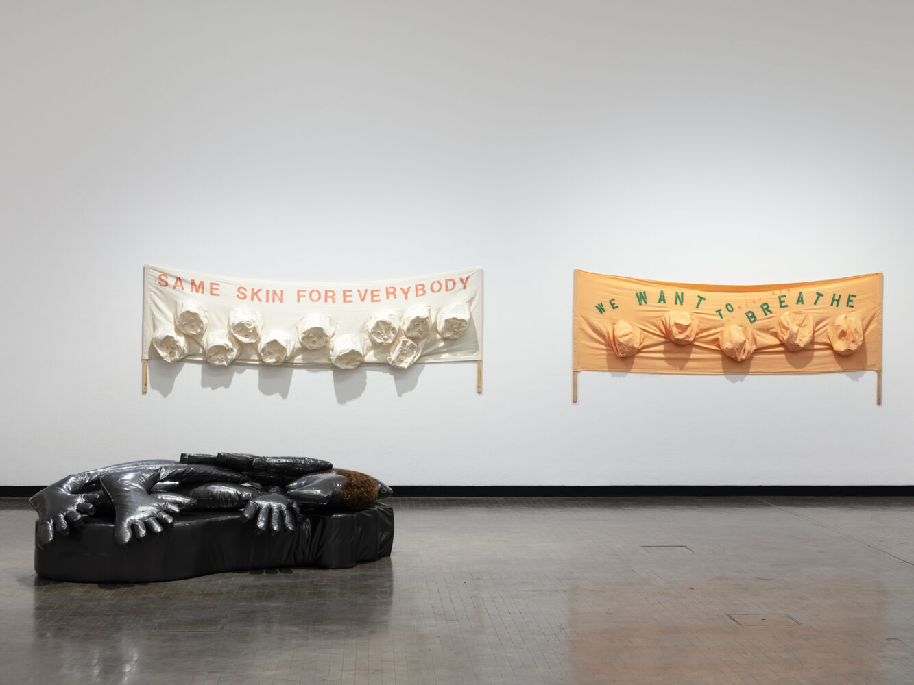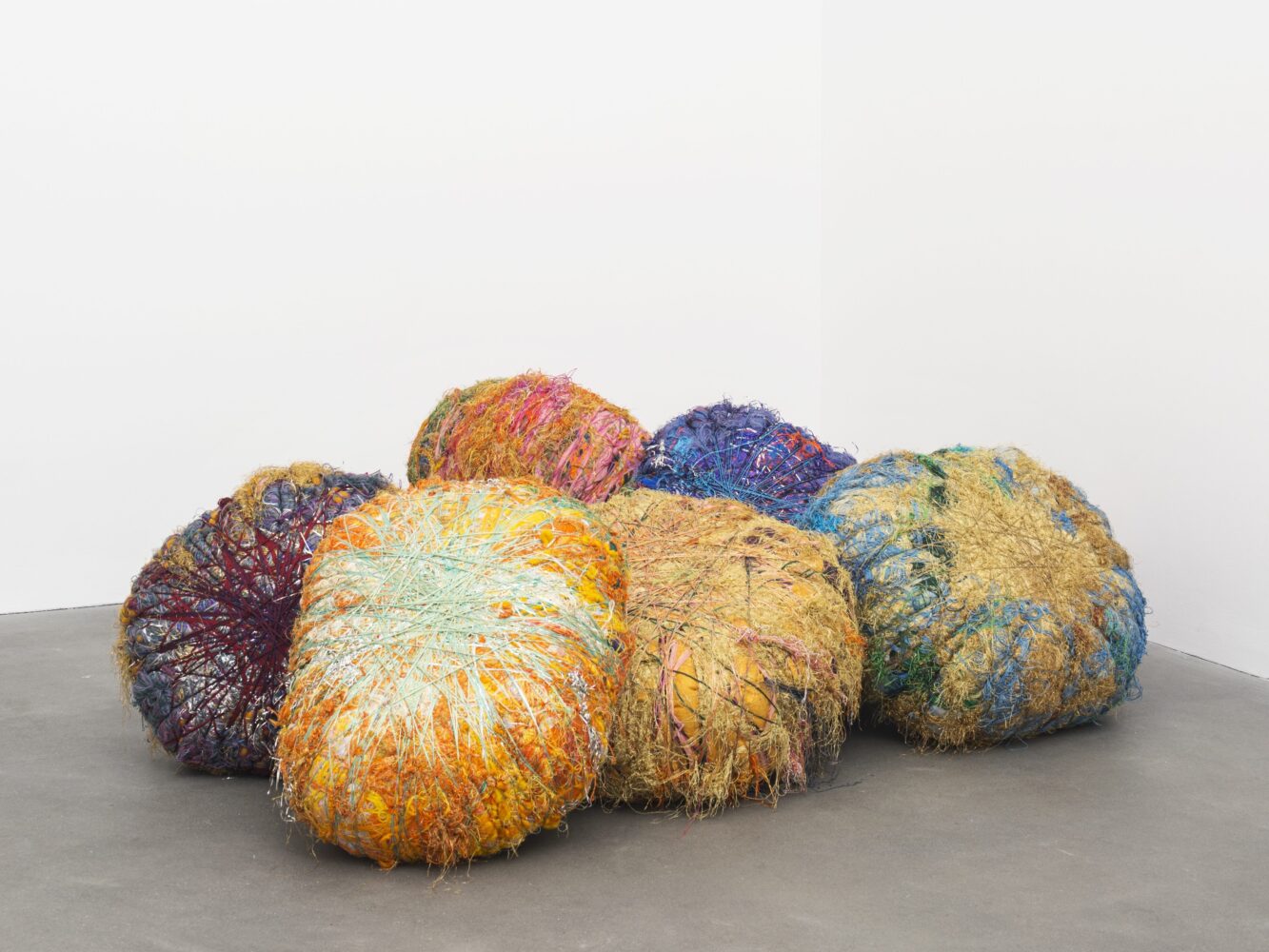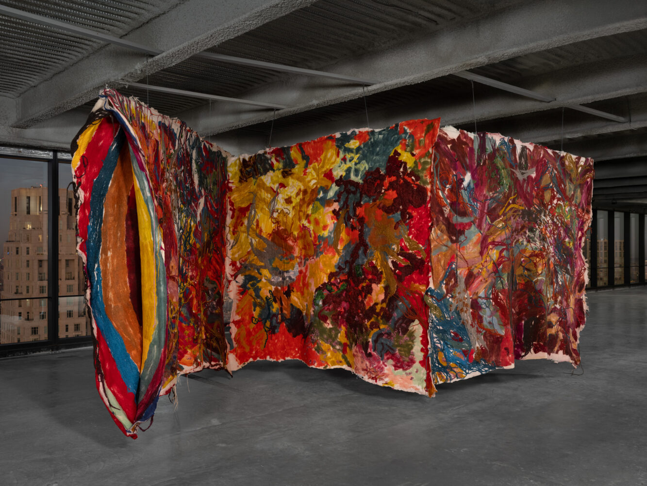 Pacita Abad’s artworks are on view Tate Modern’s ‘Artists and Society’ permanent collection display, until May 2026. Three large textiles-based works – Bacongo III, 1986, Bacongo VI, European Mask, 1990 – showcase what the artist called her ‘trapunto’ technique, adapted from the Italian word for quilted embroidery. She stitched and stuffed the textiles, adorning them with objects she found on her travels, such as shells, beads and mirrors. Her layered compositions speak to her experiences of migration and encounters across cultures.