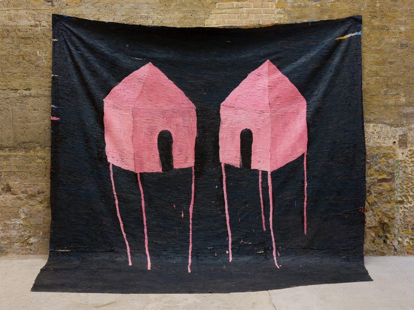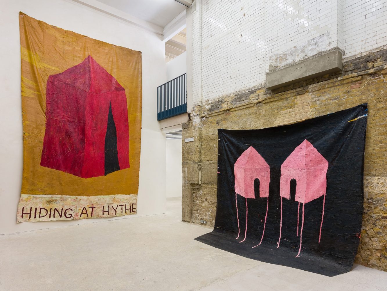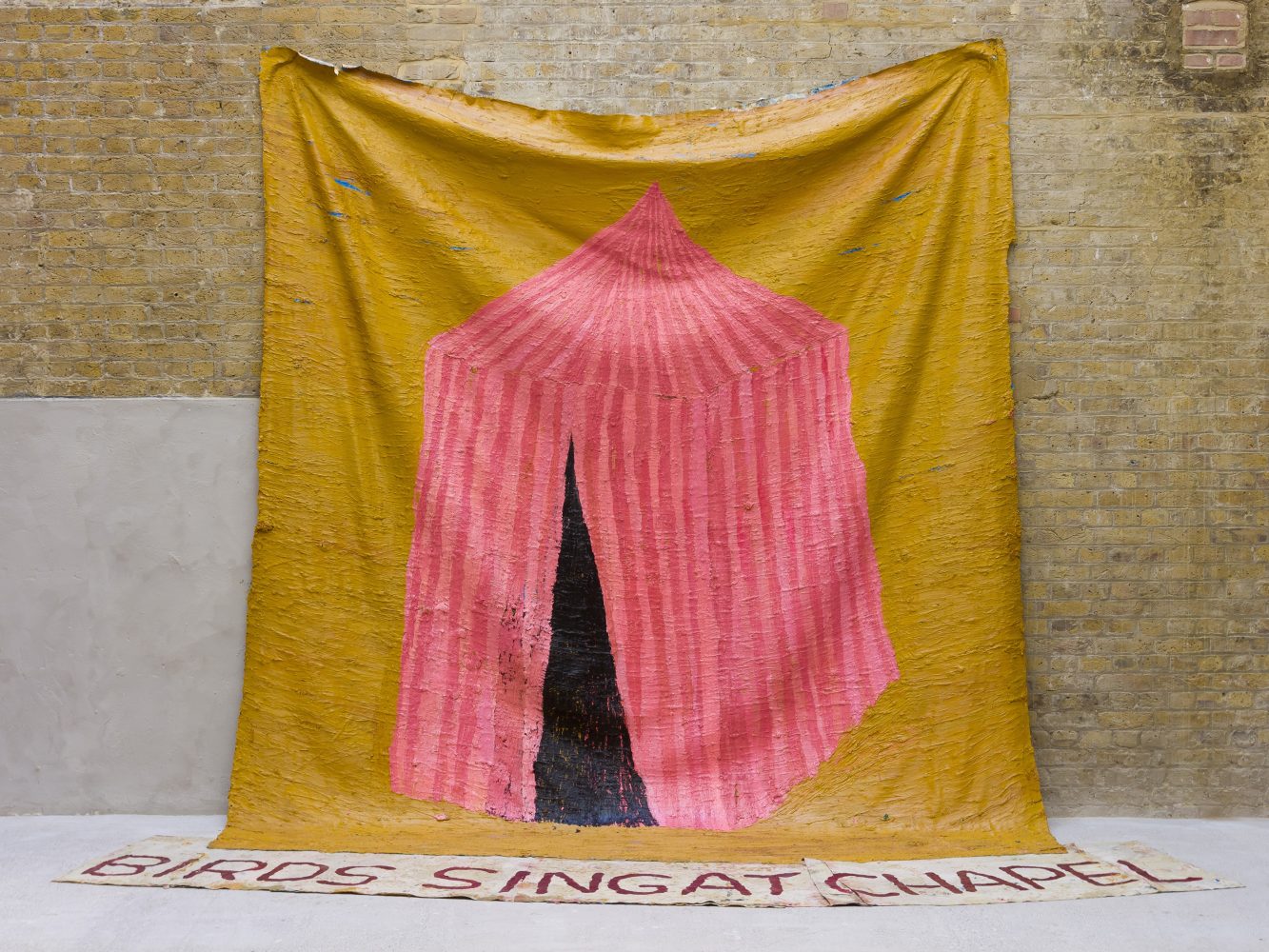 Backgrounds of dense colour support surreal forms; fragments of recalled images that have somehow stuck with her. Each are rendered on unstretched canvas and when hung become tent-suggestive of hiding spaces or theatre backdrops. Wads of used canvas are repurposed and affixed onto new works, like hosts of old ideas. Often subtitled with texts that refer to bird and tent clubs, both fictional and real, these paintings evoke Barber’s local surroundings, in and around Hastings. Barber greatly values the importance of legacy in the trajectory of painting practice looking towards a lineage of artists such as Philip Guston and Rose Wylie, as well as being strongly linked with a group of painters from the South Coast.